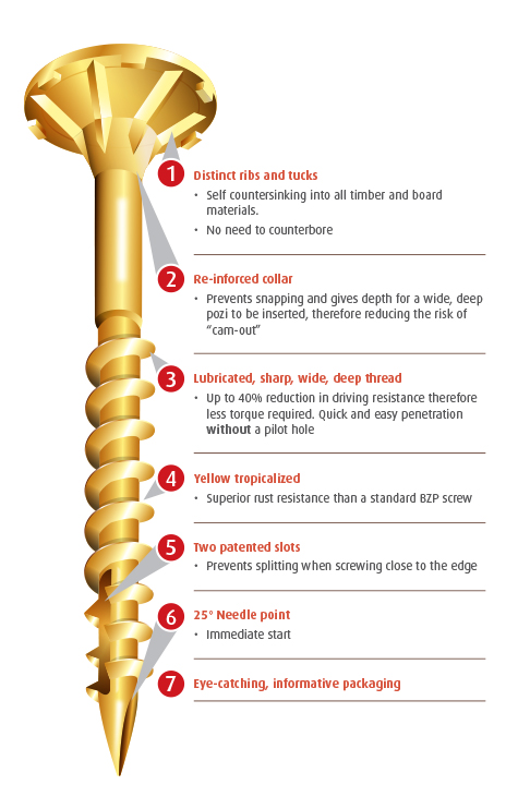 CUTTER Woodscrews represent the latest generation of technological excellence. They are uniquely designed to give ultimate performance and a perfect finish in all wood applications. The two patented slots (25mm and above) allow the screw to work closer to the edge without splitting, and the ribs and tucks under the head enable the screw to sit flush and tight without surface damage. The 20º needle point gives the ability to penetrate almost all timbers without a pilot hole and the sharp, wide deep thread with unique  lubrication gives up to 40% less driving resistance and easy penetration.