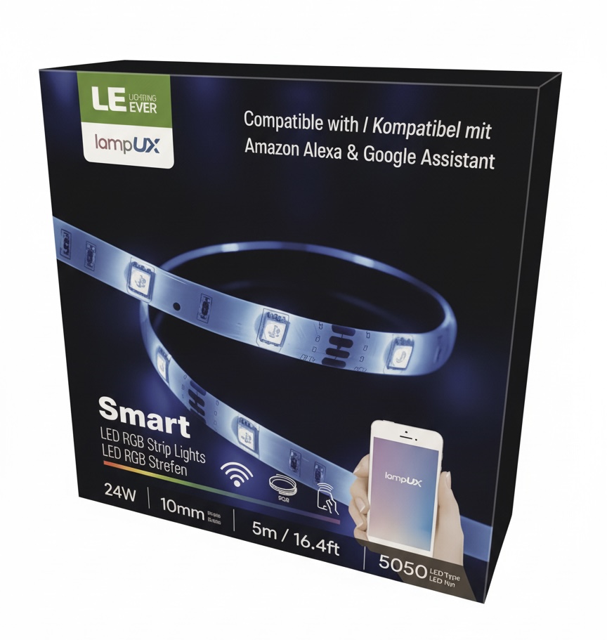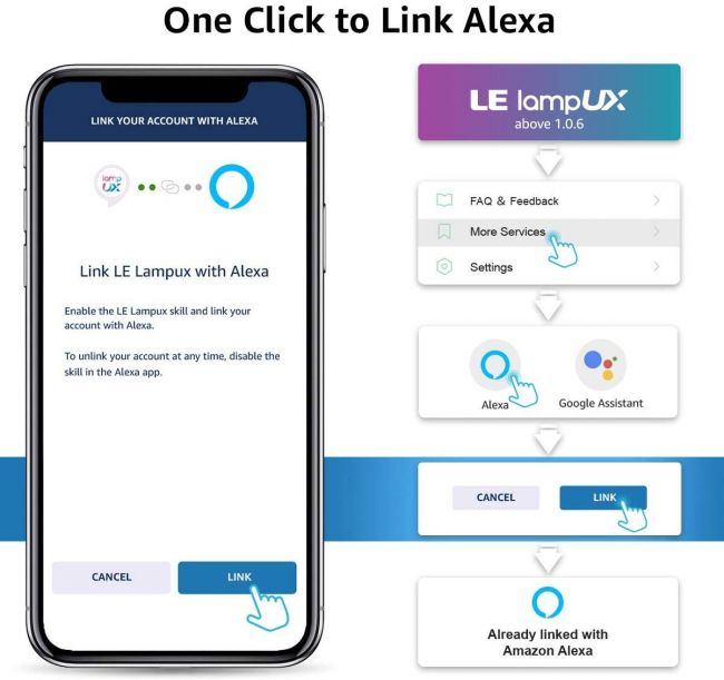- Use Alexa or Google Home APP, Search the Alexa Skill name or Google Action Name of “LE LampUX”, tap Enable